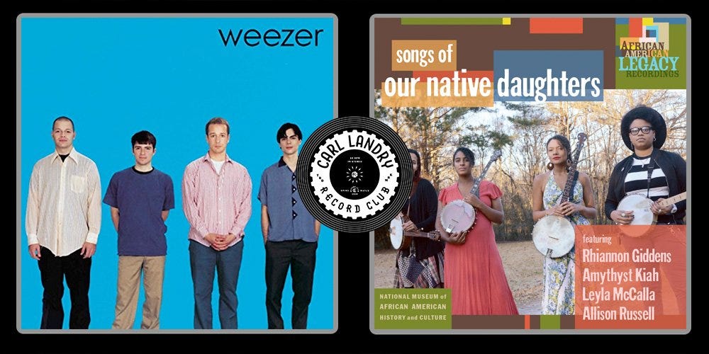 Albums discussed are 'Songs Of Our Native Daughters' featuring Rhiannon Giddens, Amythyst Kiah, Leyla McCalla, and Allison Russell (08:37) and Weezer's Blue Album (30:09)