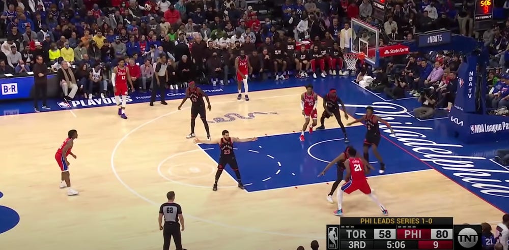 In the second series, three years later, those gimmicky schemes were all over the place. The difference between how the Raptors defended Embiid in those two series is extremely notable. In 2019, there was a lot of single coverage with Marc Gasol being trusted to guard Embiid. In 2022, there were double teams galore and lots of borderline gimmick defenses.
