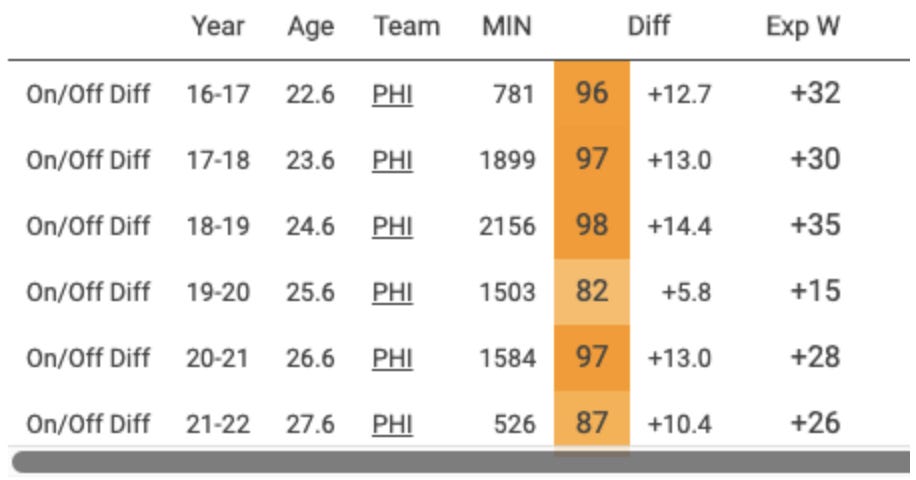 Given the amount of change that has gone on around him, it’s somewhat startling how consistent Embiid’s on/off differential has been over the years.