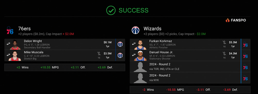 Delon Wright just recently returned from injury, so it remains to be seen just how valuable he is at the current moment. But last season, he was a rock solid bench piece for Washington. He’s a very good defensive player who could run the offense for the second unit while Maxey is on the bench. He can also play either guard spot, so he would not prohibit Patrick Beverley from remaining in the rotation.