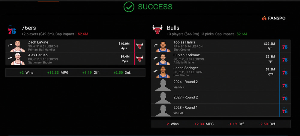 I’m not convinced I’d do this deal – I prefer the Anunoby trade – but it’s one I’d have to think long and hard about. Whatever concerns I have about LaVine from a fit or contract perspective, the fact remains that he and Caruso are simply way better players than anyone the Sixers are giving up in this trade. It is a considerable talent upgrade.