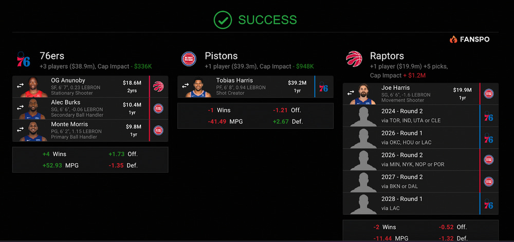 There have been multiple reports over the past couple weeks that the Pistons, for some reason, are interested in Tobias Harris. In this trade, each team gets something they want – Detroit gets Harris for salary filler and two seconds, the Sixers get Anunoby and backup guard help in Monte Morris, and the Raptors get an expiring Joe Harris, two firsts, and three seconds for Anunoby.