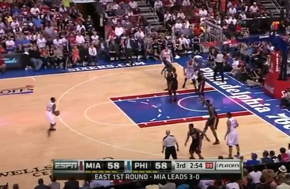 The Heatles were prone to the occasional slow start, however, and the Sixers took advantage of that in Game Four -- jumping out to a 23-8 lead, thanks to a locked-in Elton and some uncharacteristically hot shooting from distance, as Miami lazed its way through the first quarter. The Sixers' maintained their advantage until midway through the second, but if there was one characteristic of that Heat team that I'll always remember them by, it was that no matter how big a lead against you held against them, once they turned it on, it would be gone in just a few minutes -- and once lost, you usually didn't get it back. So when a 39-23 Sixers advantage turned into 45-41 Heat before the end of the half, all you could really do was give a Well That Was Fun shrug and pivot to wondering about late first-round draft options and potential free agency steals.
