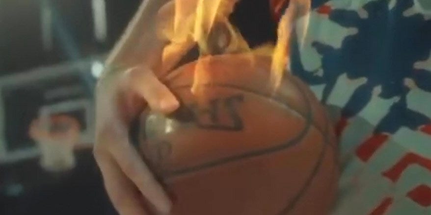 It's still a great video regardless, natch. The Scorsese-like zoom-ins. The Herb Ritts-like close-ups of Kork's glistening neck. Both the net and the ball being on fire for some reason. The wide closing shot of Furk taking off from the charge circle for a climactic slam -- just like Jordan in '87! I appreciate it all on some level, and it's clearly something Process Trusters needed late last week. But I guess there's really only one truly perfect scenario which we'd be best served saving this video for: immediately after Ben gets traded.
