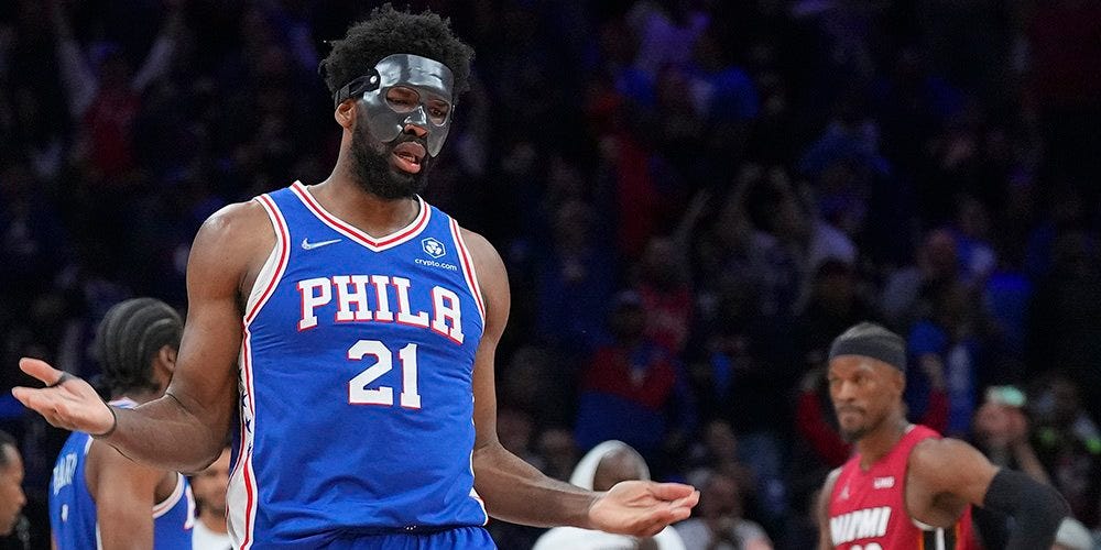 There was no way he was going to make it for Game Three, and there was no way that he wasn't. The Mikes O'Connor and Levin more or less took these seemingly opposing positions about Joel Embiid's likely availability for Friday's game in the post-Game Two Ricky a couple nights earlier. MOC said he'd be shocked if Embiid played in the game, because Jo couldn't even play Candy Crush just a few days earlier, and that the concussion and the broken face and the thumb and his general inactivity for the better part of the week was all gonna make him returning that quickly impossible. And Original Mike predicted that Embiid was gonna play, because he's Embiid and because it was killing him too much to see the Heat playing catch at the rim for two games -- while DeAndre Jordan looked around like a driver who realized he had just sped right past his exit -- for him to stay out a second longer than he had to. They were both absolutely right, even though one of them technically had to be wrong.