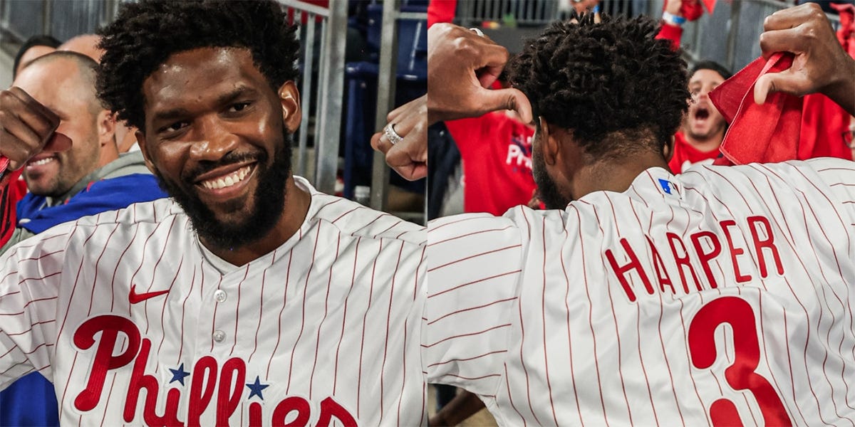 Thursday night was probably the first totally positive experience I've had with Joel Embiid since before Game 7 of the Celtics series. He popped up in the second inning on the TBS broadcast of Phillies-Braves Game 4 (fuck the Bravos, marry me Nick Castellanos), clad in the Harper #3, and for once, it wasn't knots in my stomach thinking about him sheepishly getting sonned by Al Horford and Jayson Tatum, it wasn't eye-rolls picturing his aloofness in the post-game handshakes and interviews, it wasn't the "OH BROTHER" reaction of being unexpectedly reminded of the goddamn Sixers in general. It was just, "JO!!!!!!!!!" It was good to see him. It's been a long time since it's been good to see Joel.