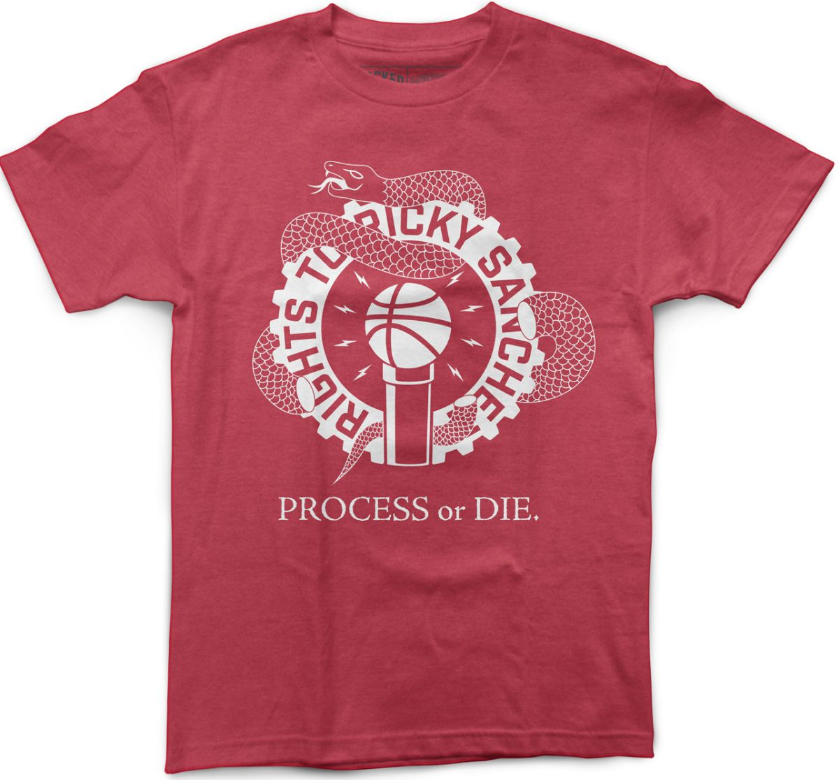 This shirt has not been available for over a year and a half, first available for a limited time prior to the 2017-18 playoff run. This is the first time it's been available in anything than black, now in this lovely heather red. It of course, features the Rights To Ricky Sanchez logo, and the snakes we all love.