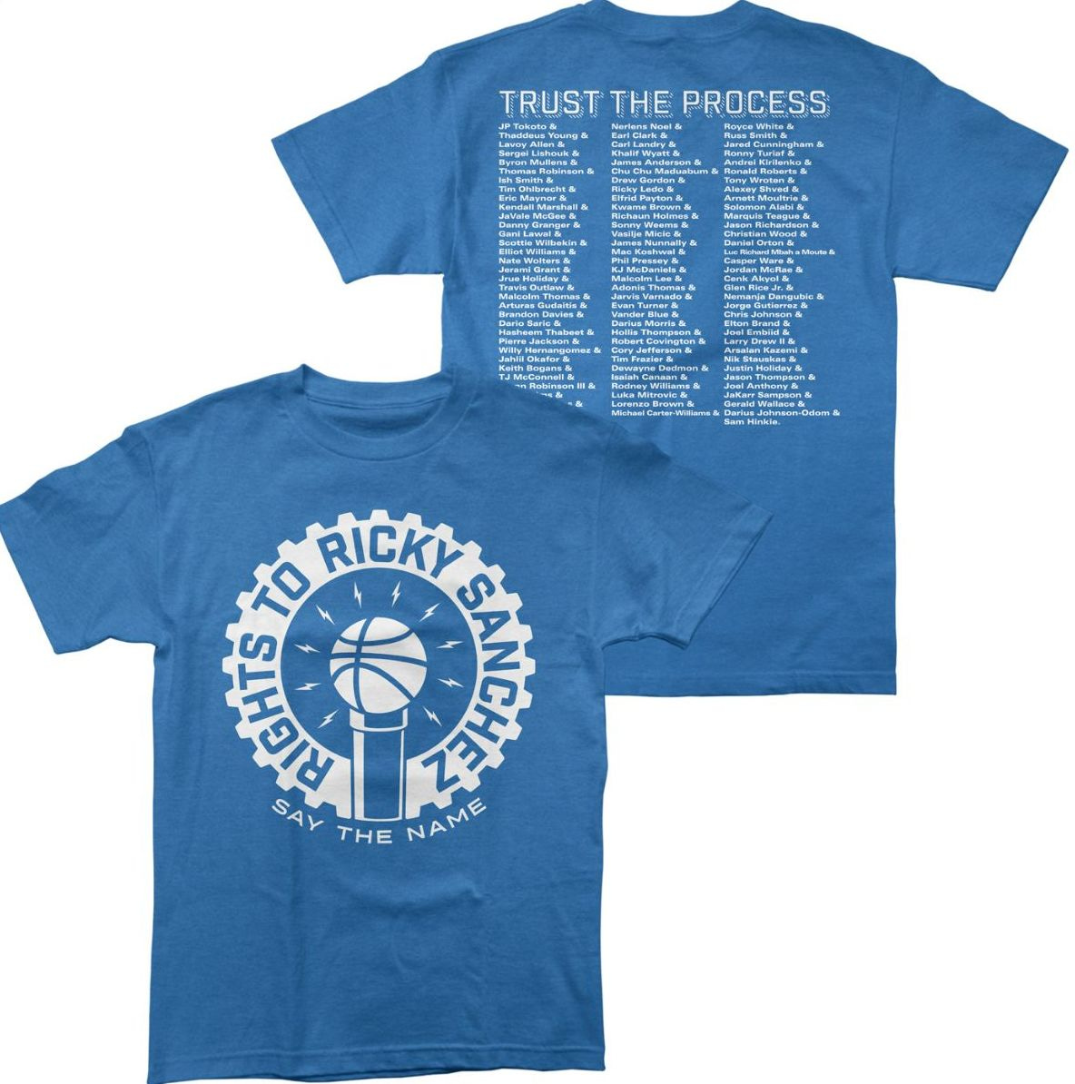 This is the most famous Rights To Ricky Sanchez shirt, originally available at the 2016 Lottery Party. It has every Process Sixer listed on the back through Sam Hinkie's tenure, and even some players that were never *officially* Sixers. This is the first time the shirt has been offered in something other than black, in this sweet heather royal blue.
