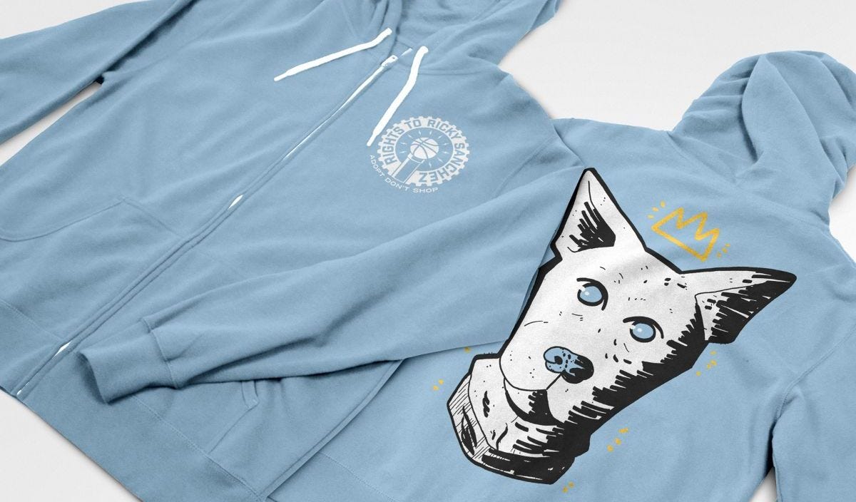 The first ever Ricky hoodie is available only for two weeks (and then a limited supply in-store at Kinetic Skateboarding). It's the Adopt Don't Shop Ricky hoodie, with a sweet drawing of Rebel looking tough on the back (thanks to @digrupert), and the Ricky logo on the front with "Adopt Don't Shop" underneath. All proceeds will benefit our friends at the Providence Animal Center.