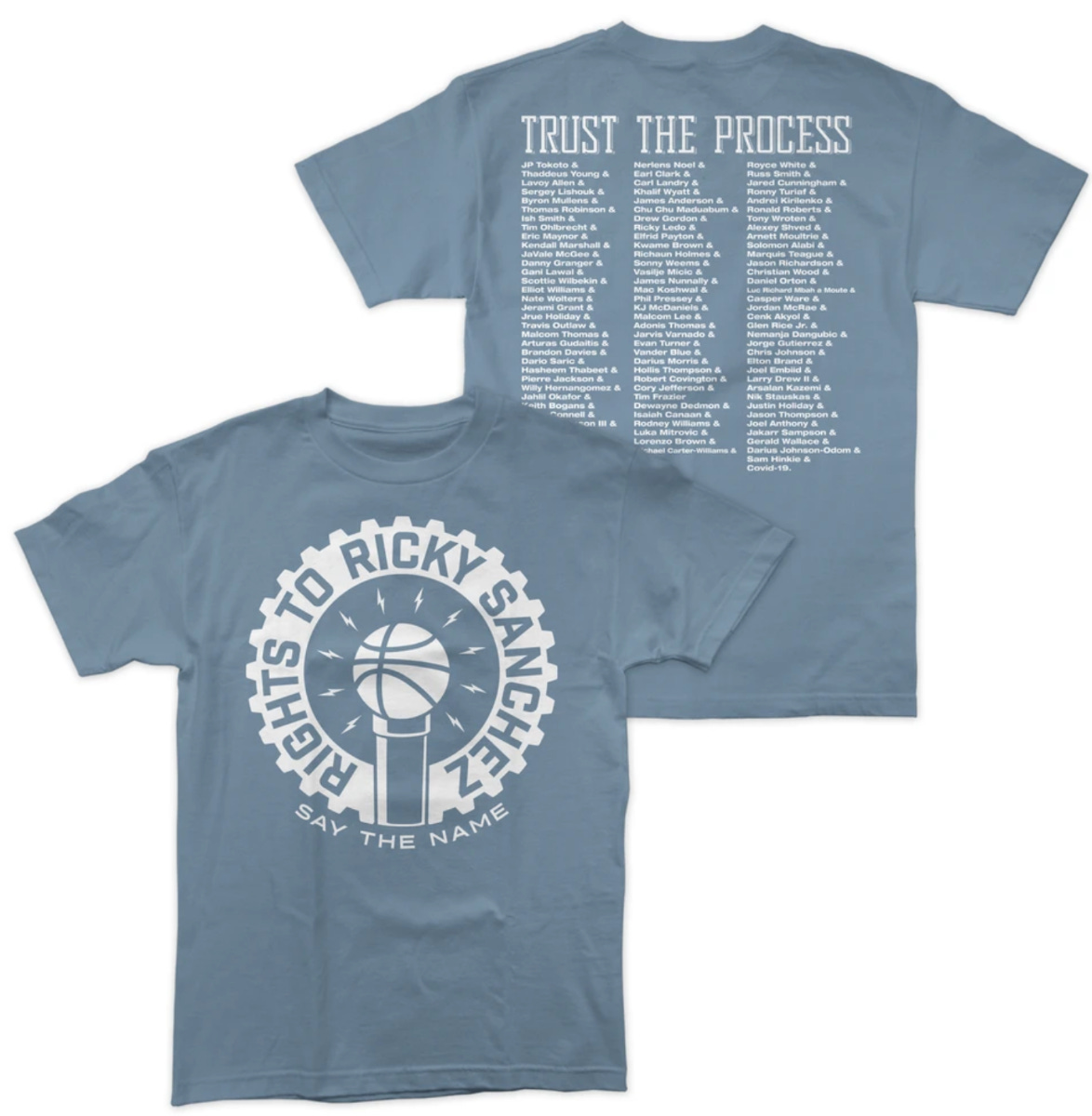 We thought the current situation, which postponed the NBA season, has everyone stuck in their houses, and also stopped Flip The Switch called for an addition to The Shirt. If you look closely, you'll see we added one more name to the list right after Sam Hinkie. Yes, for a limited time, Covid-19 is on the shirt. The thing is only $29.99, and is available now. Buy it.