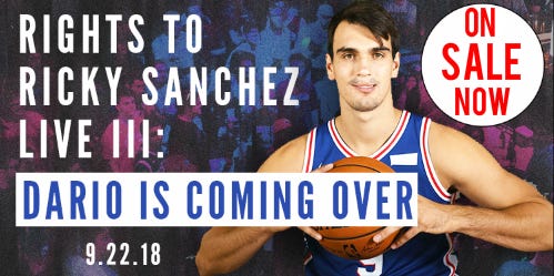 Every year when the Lottery Party sells out, Spike and Mike get emails and tweets asking if there's any possible way to get tickets (there usually isn't). Don't let that happen to you for Live Ricky III (all tickets and info here). It's an all-ages event at the legendary Electric Factory on September 22nd. Dario Saric will join us live on stage, where you'll give him a hero's welcome like you did for Rock and TJ. It will be a moment. We will also have amazing induction speeches for our Process Hall of Fame inductees (don't forget to tweet at Embiid to get him to do his own). We've got a show intro from (not) Bill Simmons too. We'll be opening the show with an amazing live performance of "Imagine (The Process)" from Felicia Ricci. You might remember this great little number from the Lottery Party, originally recorded by Eliza Hardy Jones (it's also in this pod). There are seats this time so you can bring your kids and loved ones.