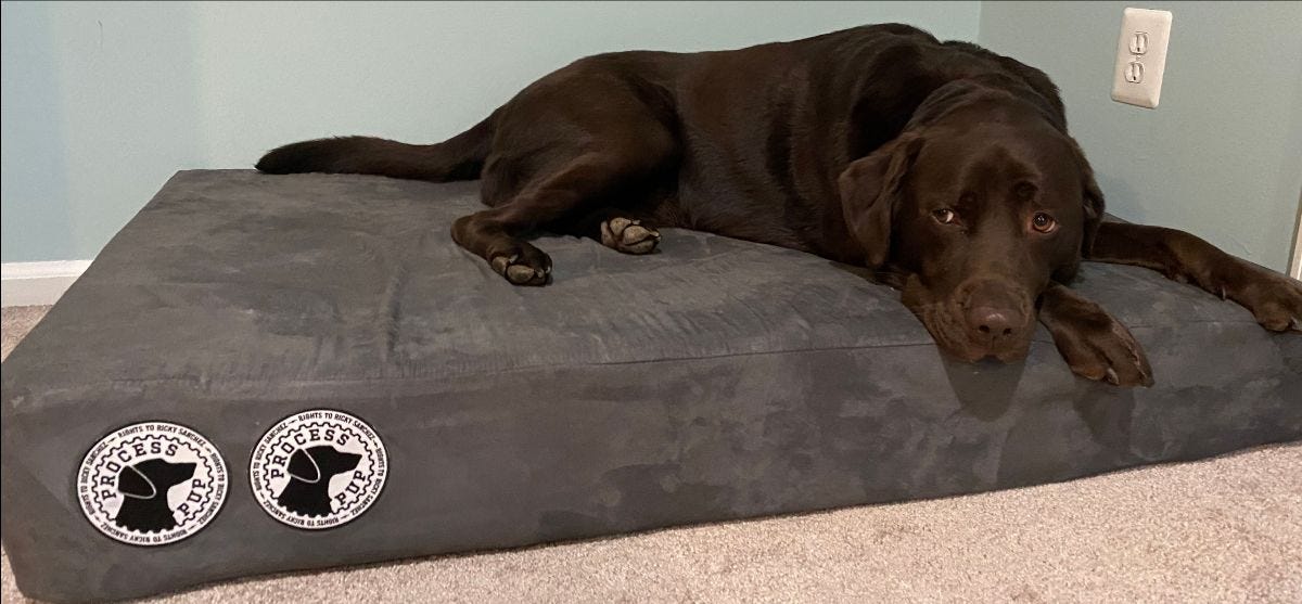 This is Samwell. Samwell is a rescue who now lives in Plymouth Meeting after hailing from the great Northeast. Samwell now sleeps on a real bed that supports his joints, a Big Barker. Lucky for him his parents ordered at bigbarker.com/ricky so he got TWO Process Pup patches. Do it for your dog.