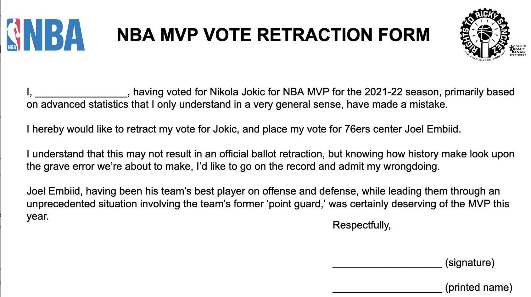 We are offering NBA MVP voters the chance to retract their vote for Nikola Jokic, admit their mistake, and say they should have voted for Joel Embiid. They have until tipoff of Game 4 on Saturday.