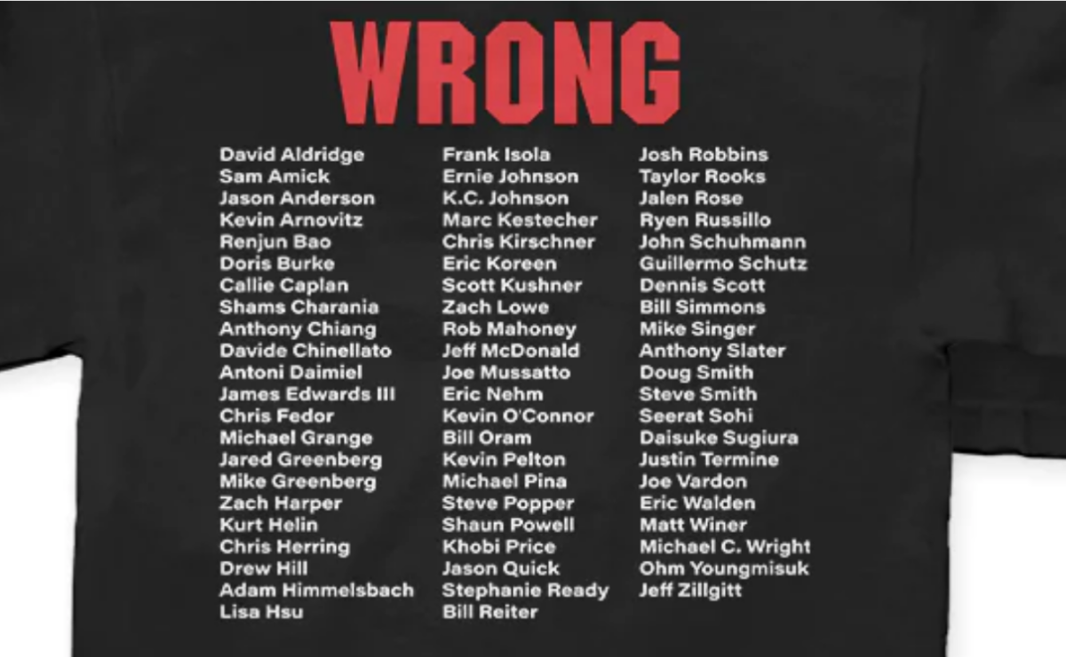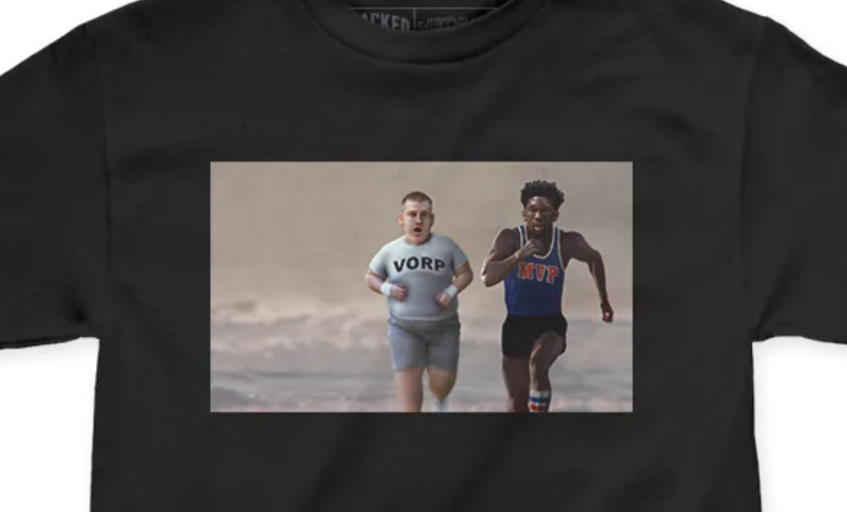 The front, inspired by the beach scene in Rocky III. The back, everyone who voted for Jokic. On sale now, limited to 300 total shirts. Get it here.