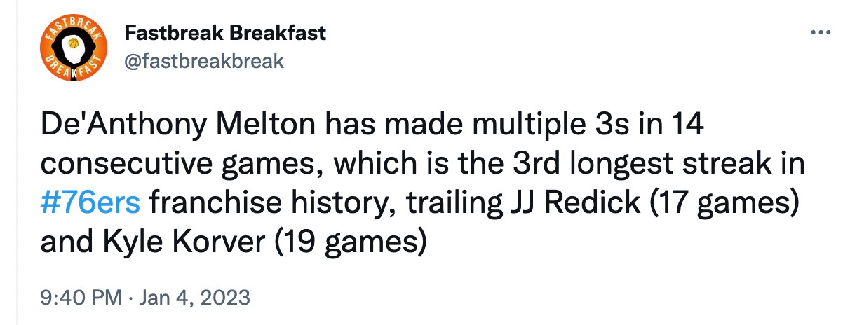 But the Sixers are 8-2 in their last 10, won a game without number 21 and are on (another) win streak and only 3 games out of first place. No seriously, don't look now. If we only act semi-impressed they'll keep trying hard.