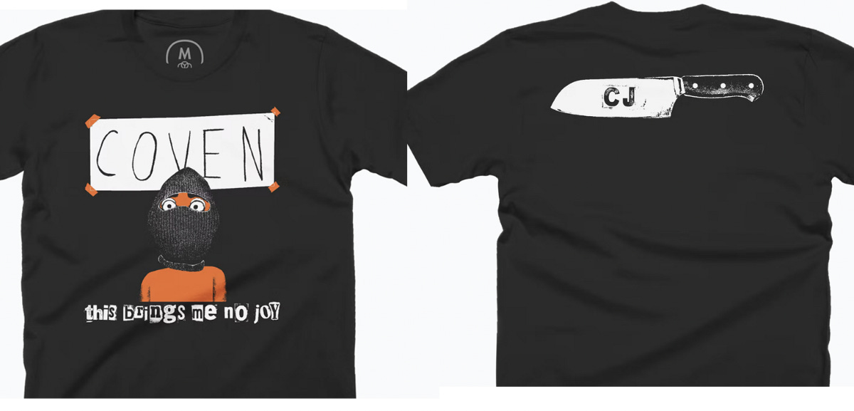 COVEN - Count Our Votes, Even Now! A two-sided tribute to the anonymous member of the terrorist organization known as COVEN. On the front "This Brings Me No Joy," and on the back, a knife emblazoned with CJ on it. BUY HERE