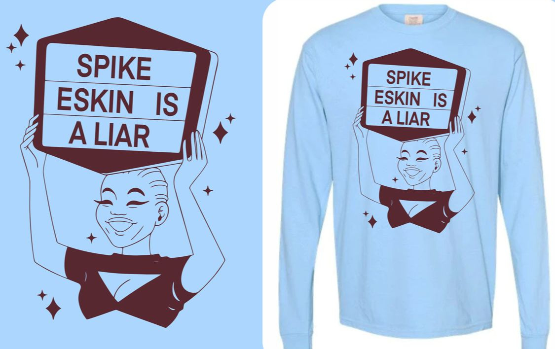 Abbie designed the Spike Eskin Is A Liar shirt so a) you will have to explain it to people but b) that people will want one too.