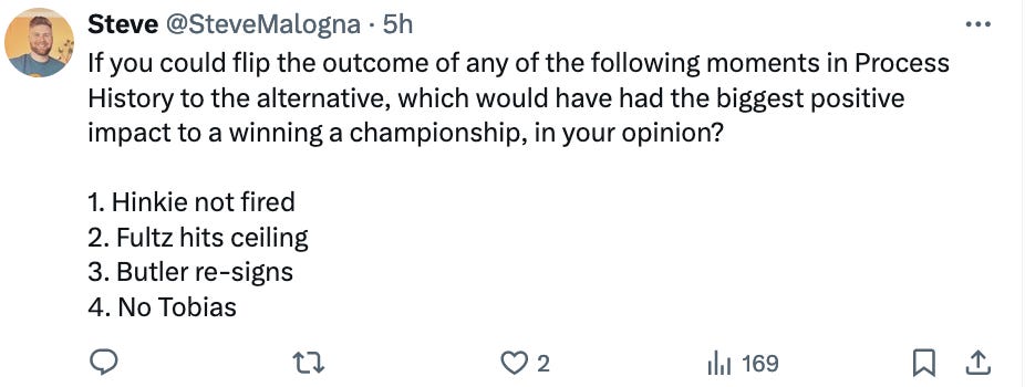 Easily Hinkie not fired. Not because I think it’s the most likely scenario in which we win a title (thought it might be), but because I’m most curious about what would happen.
