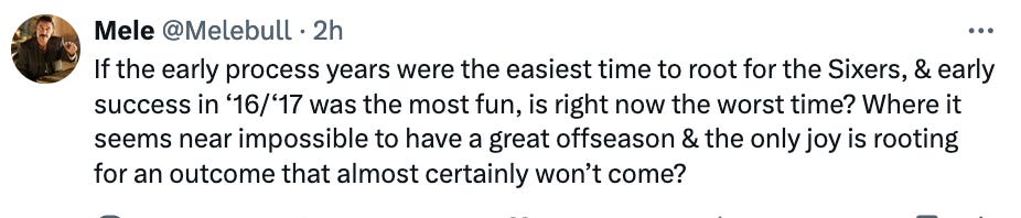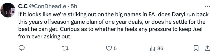 To me, Daryl sounded particularly frank and honest during that press conference and I tend to believe that he’d go with one year deals and role players and wait for a star to shake loose. Essentially that’s what last year’s team was and it would have won 55 games if we had normal Embiid health.