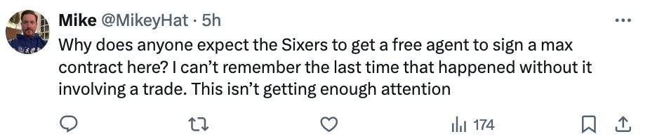 Let’s reverse engineer this… how many times have we had max contract space under the cap, with two star level players already under contract? Not as long as I remember. The last max-level free agent who signed here was Elton Brand (shout out Philly Max).