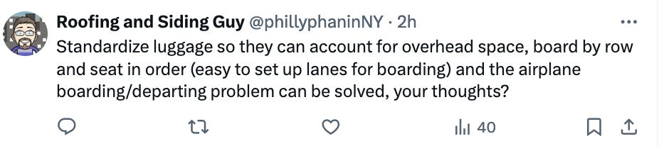 Awesome idea! Won’t ever happen. They can’t even get people to turn off their cell phones and put on their seatbelts, much less get every company in the world to make the same size luggage and get everyone to buy it.