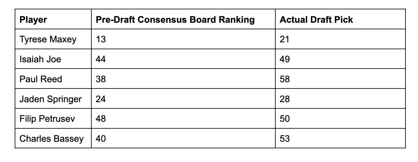 It planted the idea in my head — what if Morey just drafts relative to a consensus board? There’s not a ton of available data on this for his drafts with the Houston Rockets, but there are easily accessible consensus boards that were published prior to the 2020 and 2021 drafts. Jon Chepekevich over at The Rookie Scale has been tracking and compiling consensus boards for a while now, and his data supports the assumption — Morey has consistently selected draft day “fallers” during his time with the Sixers.