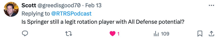 Springer isn’t a center or a point guard. Those are the only two people on the court who can sometimes get away with not being able to hit an open three. Springer is neither, he has to, and he can’t. Maybe he will! But also he doesn’t seem any closer to it than he did his rookie season.