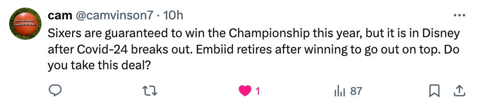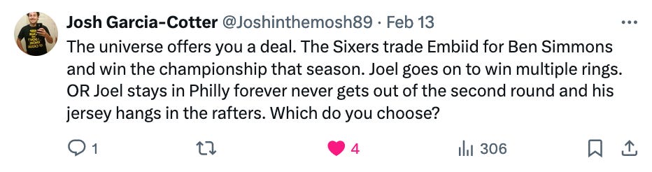 I would find no joy in a Sixers championship after they’d traded Embiid for Ben Simmons. The amount of told-ya-so horseshit I’d have to go through from all of the Ben Simmons Stan Cockroaches who have been in hiding for a couple of years now would be unfathomable. “This brings me no joy,” an incredibly wise man once said. Also, I’d never be able to enjoy this because I’d be in jail for murdering Daryl Morey.