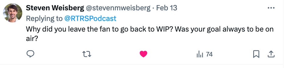 However, this was a special, particular situation that was attractive to me. I love and respect Ike and Jack very much, and the opportunity to work with those two people specifically was attractive to me. As well, I think given my decade-plus of managing show hosts, I will just be much more prepared and better at actually doing it than I ever was prior. Also, it’s WIP, and a chance to do it in the place I was born and raised in. Finally, the opportunity to sleep later (I’ve been getting up around 4am for over 20 years now), was particularly attractive.
