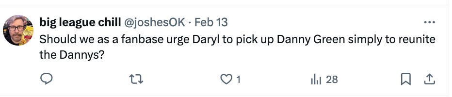 So far so very good on Cam Payne & Buddy Hield and as much as I adore and honor patron saint Pat Bev I lie with the party that believes more in the Cam/K-Low tandem in the playoffs, especially Lowry who will be good for taking one backbreaking charge and pissing off an opposing guard by just being himself on defense. There’s only so much prodding around the edges you can do so I’m mostly fine with what Daryl did, fully understanding that there’s just so much you can do while waiting for the big fella and his flap to heal. I’m not a big Lavine guy and DeTozan, eh, so let’s leave it be and pray for a post all-star win streak.
