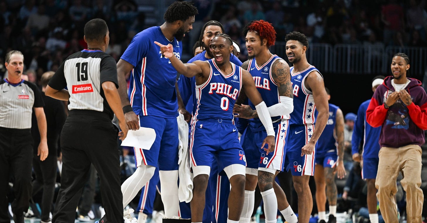 The funny thing about playing the better part of a month with nearly all your good players out is that when they’re all finally, suddenly back, it feels like you’re trotting out a full-fledged All-Star team every night. Of course it helps with that when you actually do have three multi-time All-Stars in your starting lineup — but even that feels kinda surreal with this team, especially when they’re all playing at that level like they were in Charlotte. Three? We have three star-level players on this team? At once? I mean that’s cool. And then you remember we still have VJ Edgecombe — who definitely reached another level towards the end of his one-man-show run in mid-late March — and Kelly Oubre Jr.’s back too, and Quentin Grimes is still chilling, and hey maybe Justin Edwards is a thing again, and holy shit are we even allowed to have this many dudes on one team? Do we need to worry about Adam Silver intervening again?