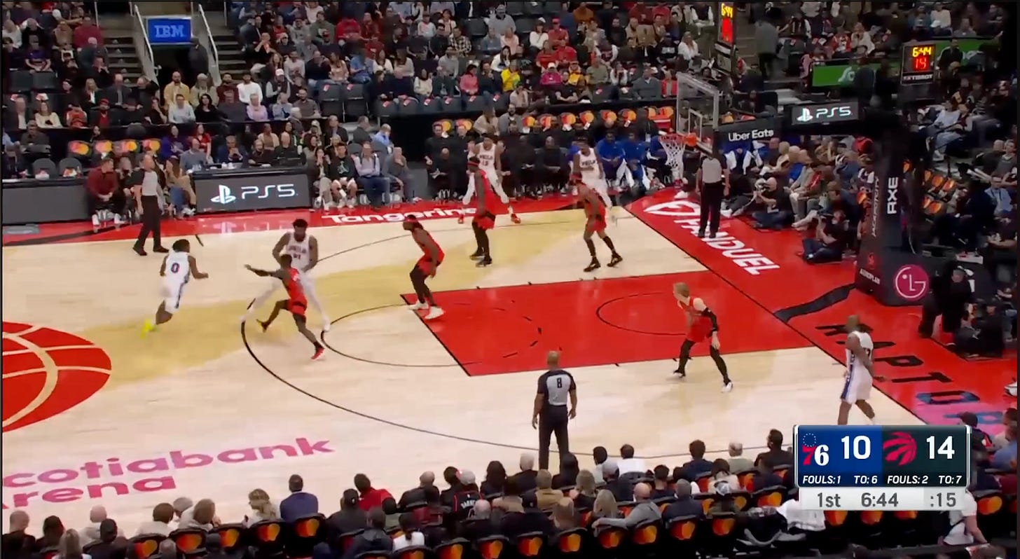 If you caught yourself feeling like their two man game hadn’t quite had the same synergy earlier this season, you weren’t wrong. In ‘23-24, defenses were guarding their two-man game much differently. At that time, the primary concern defenses had was keeping the ball out of Embiid’s hands as a roller. As such, teams generally defended their pick and rolls with some form of a drop coverage on Maxey. If that meant giving up pull-up 3s for Maxey, so be it. They did not want Embiid catching the ball in wide open space with room to either pull up in the mid-range or drive to the rim. Here’s a screen grab from a 10/28/23 game against the Raptors: