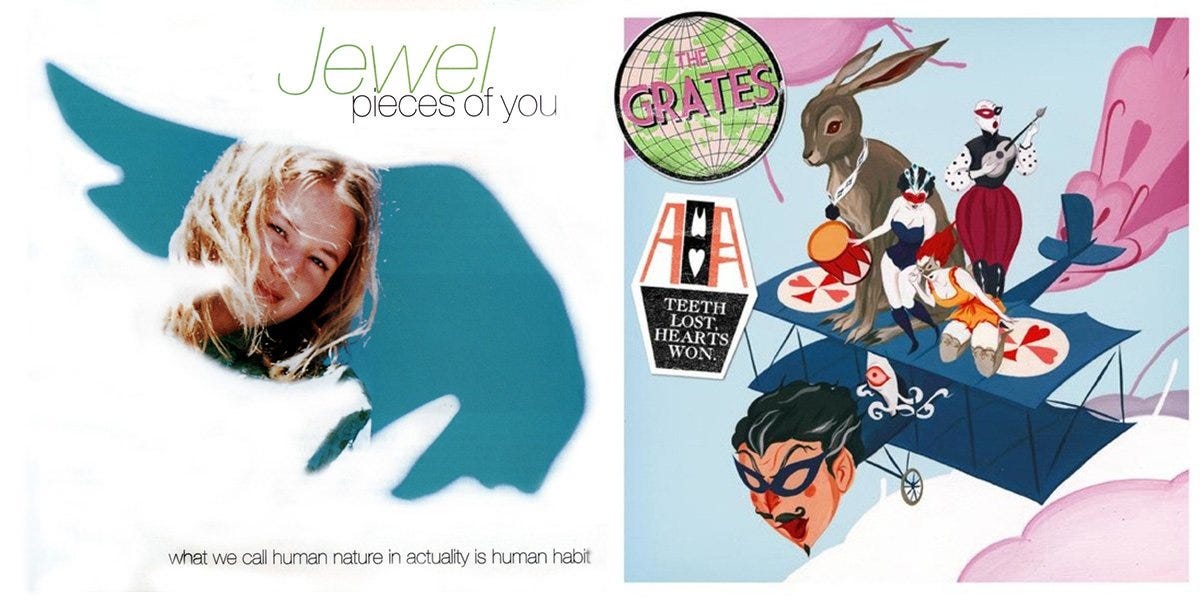 Albums discussed are The Grates' 'Teeth Lost, Hearts Won' (04:02), and Jewel's 'Pieces Of You' (38:01).