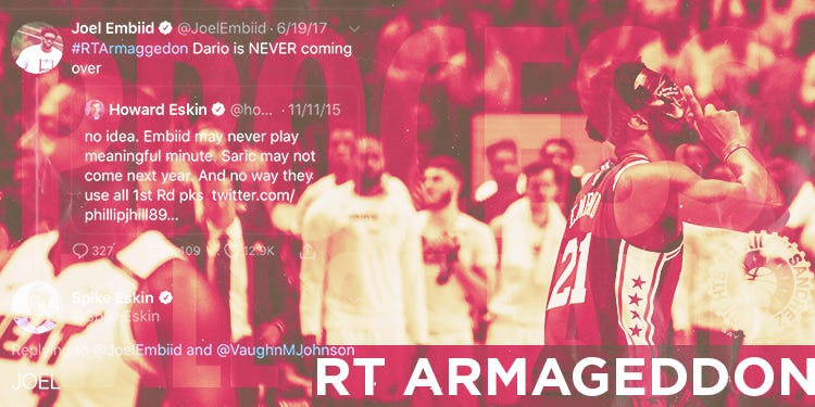 But if you needed any kind of validation that Retweet Armageddon was the right move, regardless of consequences, all you needed to know was that it was graced by one of the two guys whose opinion actually matters: Joel Embiid, who RT’d none other than anti-Process paterfamilias Howard Eskin to mock his take about Dario not coming over. (He misspelled his RTA hashtag of course, though to be fair, Armageddon is definitely one of Those Words.) It was a good reminder that the Process is unlike any other fan movement in sports history, one whose us vs. them mentality actually includes the star player we’re rooting for in the “Us” category. What else could you possibly ask for?