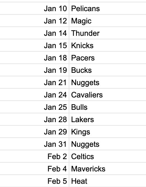 A: Also six games, and sandwiched right in between the two road trips. The Sixers close out the toughest stretch of their entire season (more on that later) by welcoming all of the Lakers, Kings, Nuggets, Celtics, Mavs and Heat to the Wells Fargo Center over the course of a single week in late January.