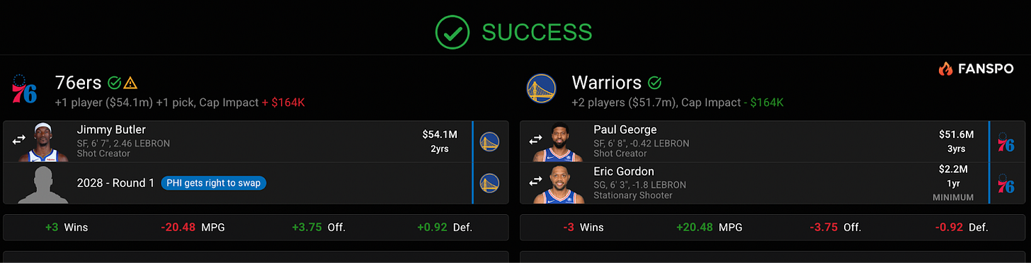 The most obvious trade partner there is Golden State. With Jimmy Butler out for the season and likely most of next season, the Warriors’ only hope of salvaging what’s left of the Curry-Draymond-Kerr era is trading Butler for a high-level player. With Butler’s contract being a year shorter than George’s, the Sixers open up some flexibility in 2027 while recouping a pick swap in 2028 that could prove quite valuable.