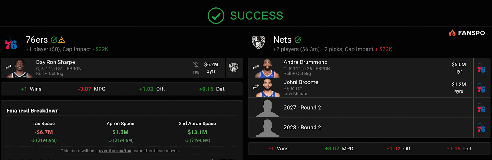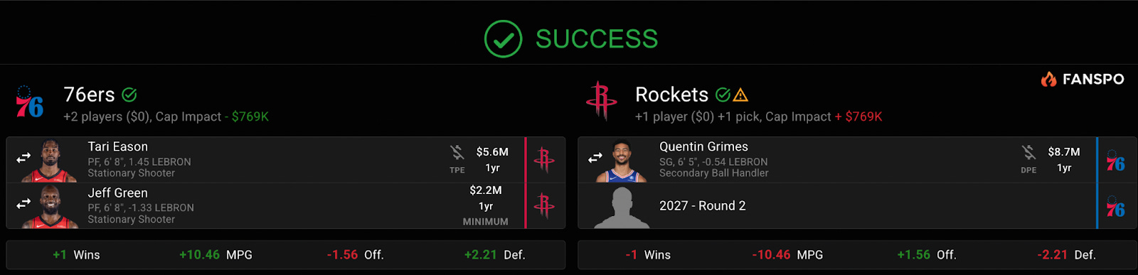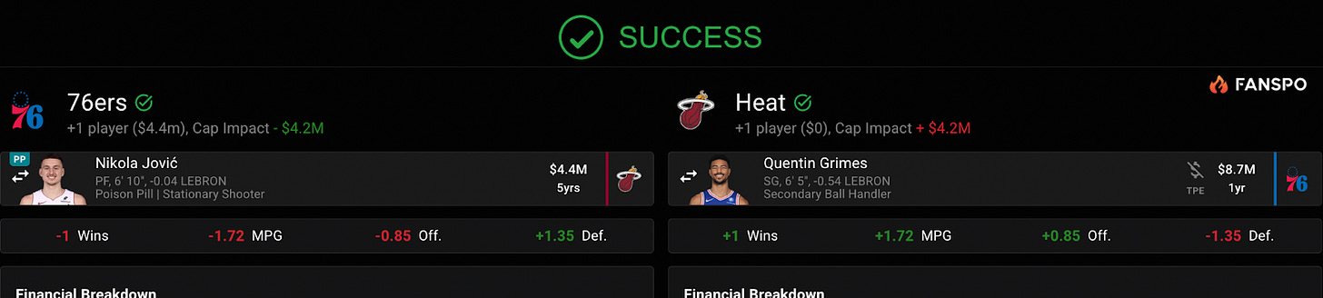 An alternative but similar-ish option to trading for Eason would be trading Grimes for the cheaper-this-season Nikola Jovic, who is having a down year in Miami, but is signed to a reasonable deal at around $15 million per year that kicks in starting next year. This deal would help the Sixers shed some precious luxury tax money for this year while helping to fill the power forward need for years to come. For the record: I think Eason is a much better player than Jovic, but trade value is roughly equal given that Jovic is already locked up on a reasonable long term deal.