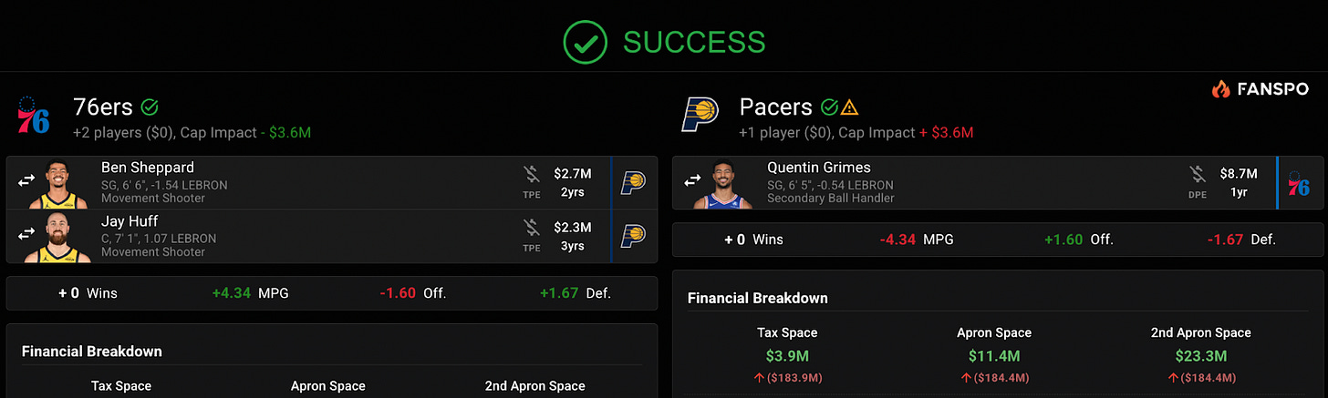 A slightly less inspiring option would be sending Grimes to Indiana, who despite being deep at the guard position may look at Grimes’ speed and style of play and view him as a nice long-term fit despite the team not being competitive this season. In exchange, the Sixers would get an excellent stretch five option in Jay Huff and take a flier on Ben Sheppard, who could be interesting if the jump shot ever becomes average or better.