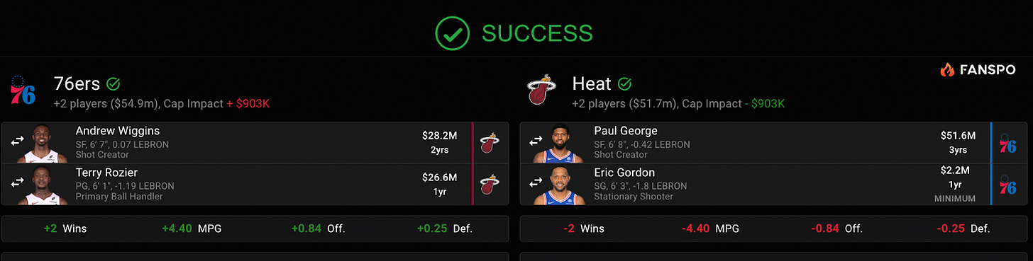 The only other type of George trade that might make sense in terms of getting off his salary is a team stuck in the middle that’s willing to take on some additional years of big money to potentially raise their ceiling. Miami makes sense there, given their ample tradeable salary, lack of draft assets, and never-ending play-in status. George certainly offers a level of steadiness and well-roundedness to his game that Wiggins simply does not.