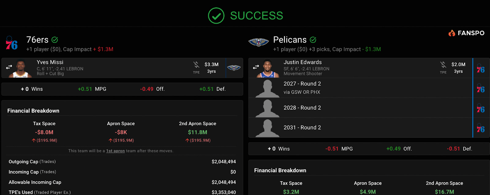 In 2023, they traded Matisse Thybulle and a second round pick for Jalen McDaniels and two second round picks – a move that saved them a couple million dollars, while also getting a fringe rotational player at a position of need. In 2024, they gave up three second round picks for Buddy Hield, while also salary dumping Danuel House, Jr. and Jaden Springer. In 2025, they traded Caleb Martin for Quentin Grimes, while also salary dumping K.J. Martin.