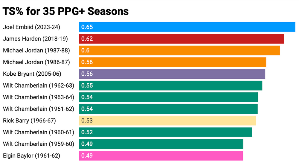 In total, there will have been only 12 seasons in NBA history where a player has averaged over 35 points per game if Embiid keeps at this pace, and no one — not even 2018-19 James Harden — can rival the efficiency at which he scores at that high of volume.