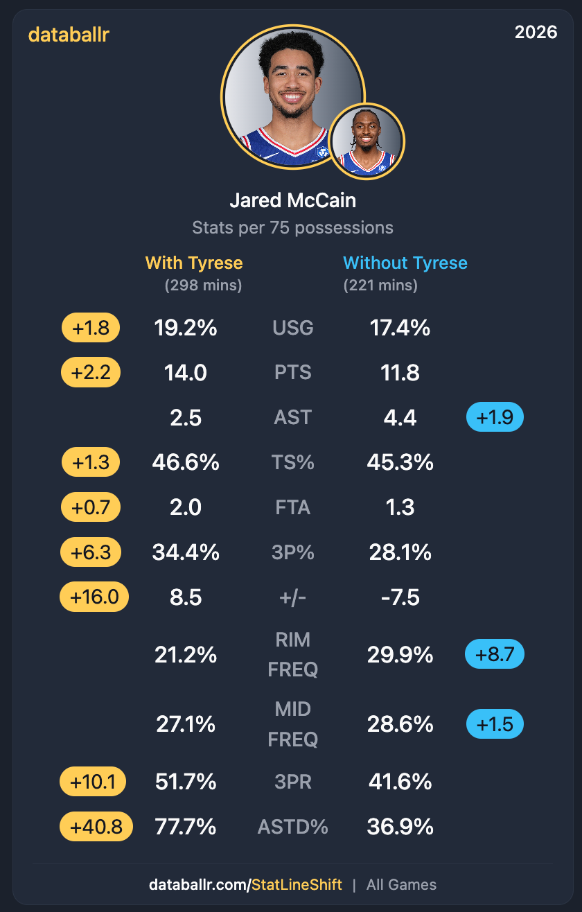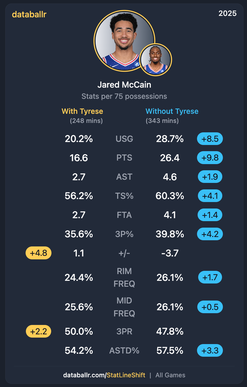 That context matters, but it doesn’t tell the full story. The real separator is how McCain performs with Maxey on versus off the floor.